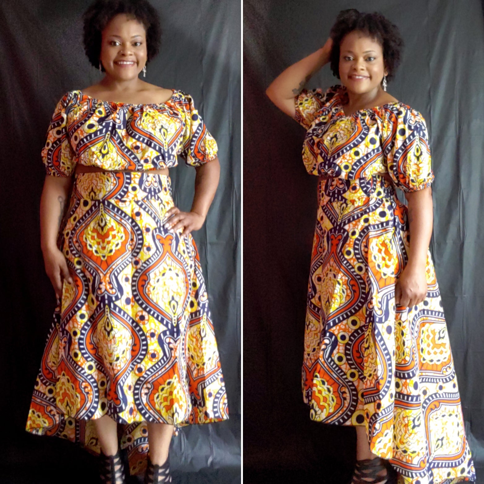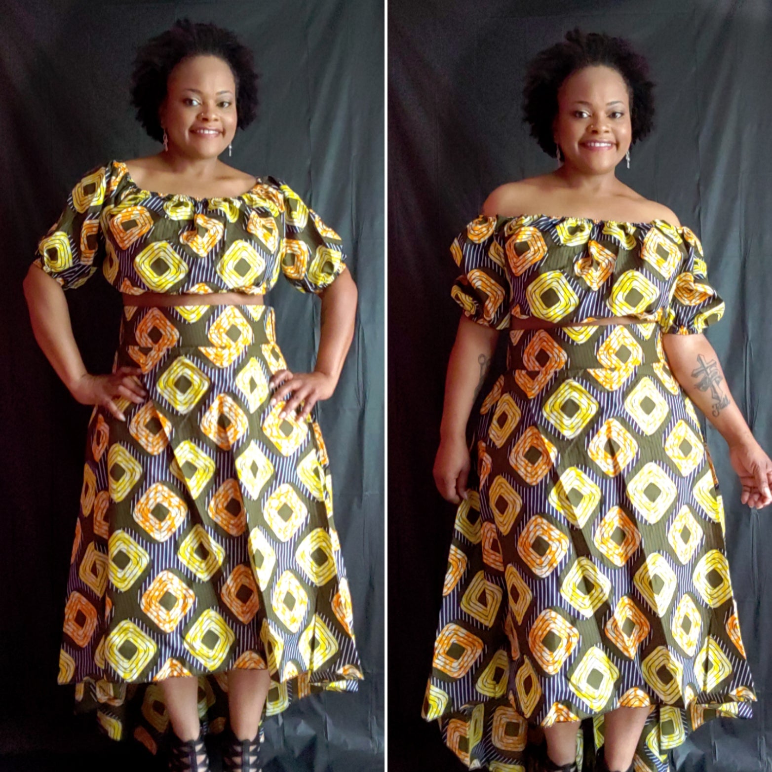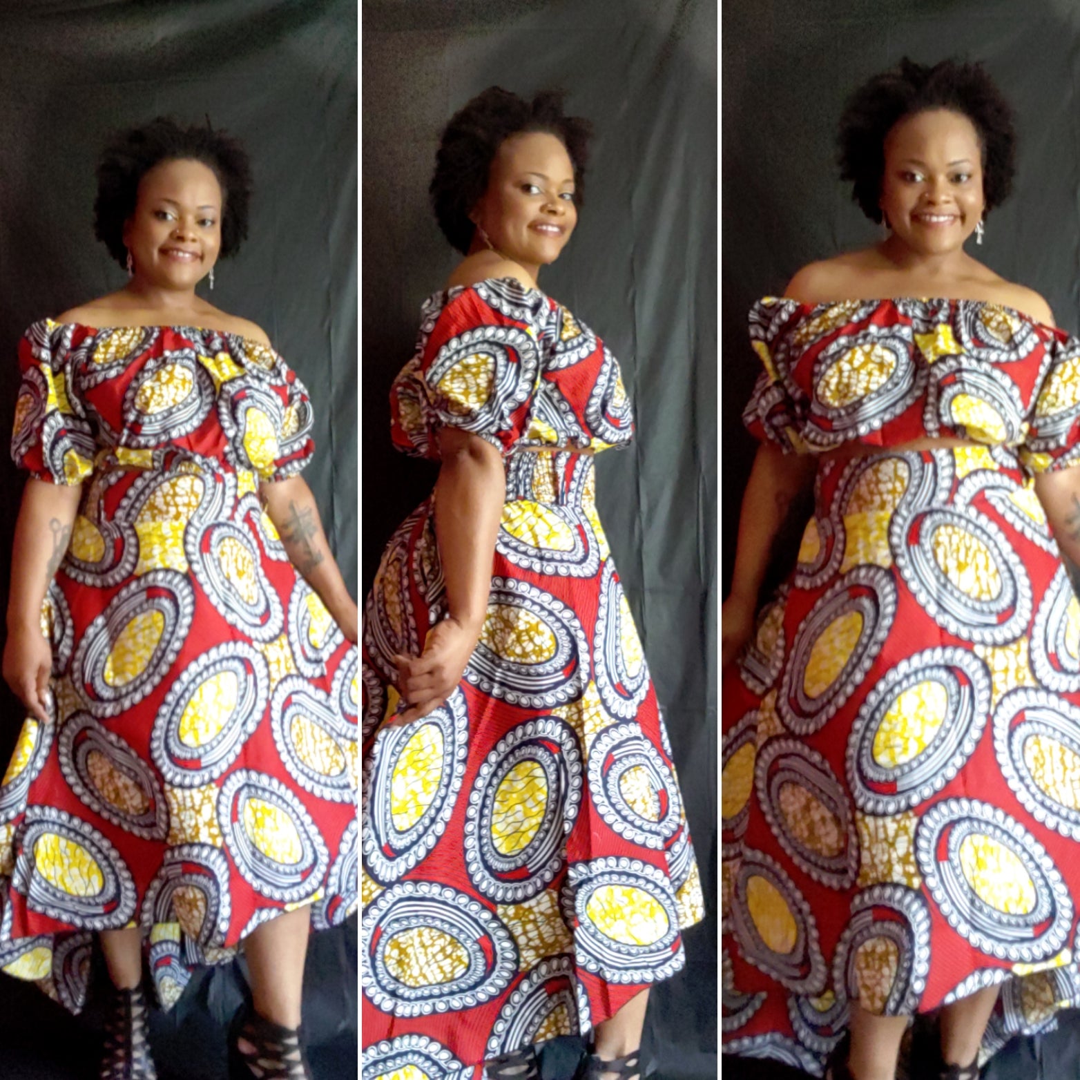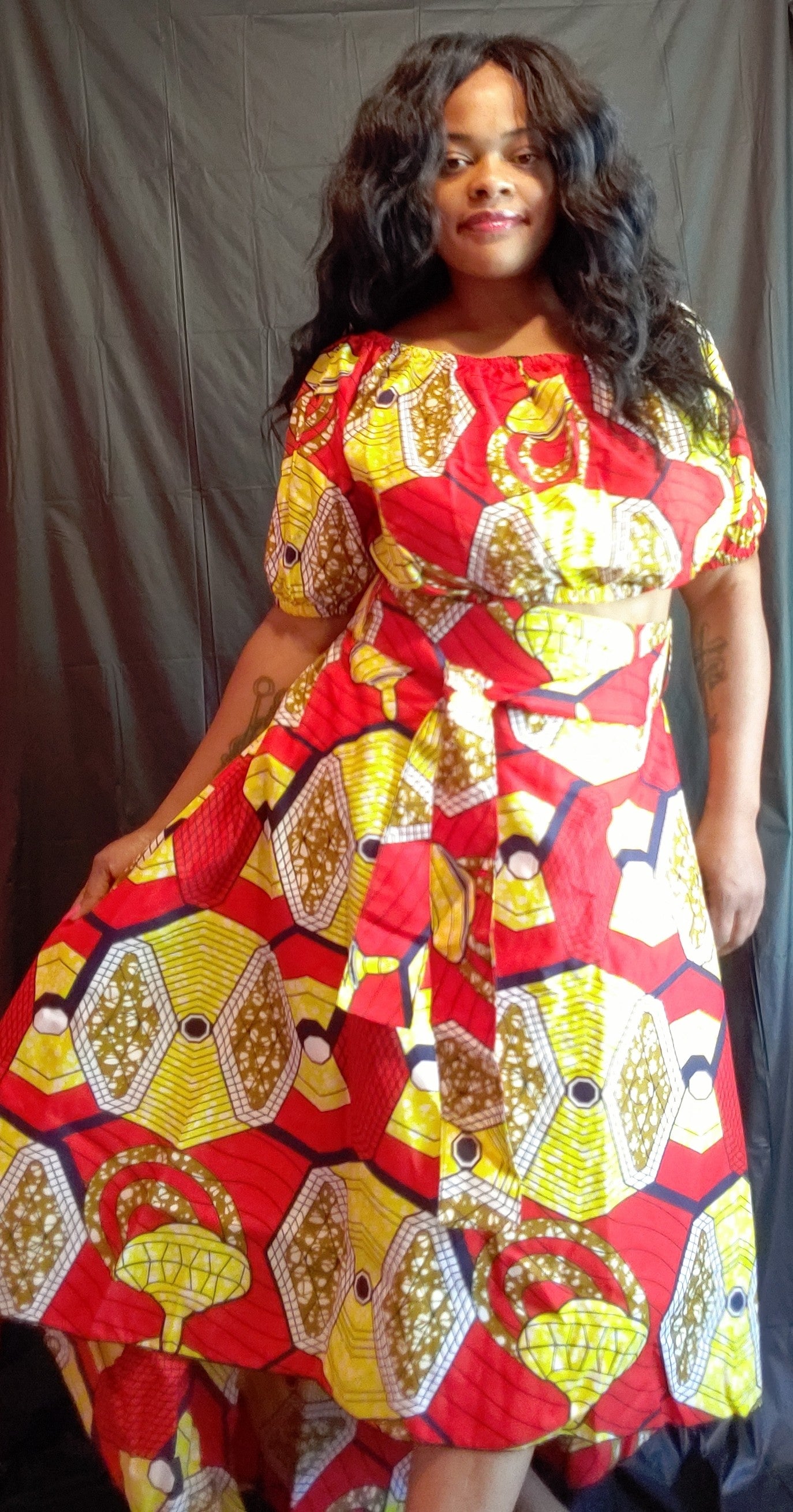 3 piece skirt set. The set includes a skirt, top, and belt. The skirt is hi-lo. The top can be worn off the shoulders.